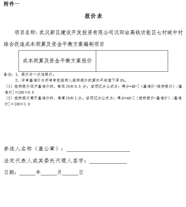 武漢新區(qū)建設(shè)開發(fā)投資有限公司正在開展?jié)h陽站高鐵功能區(qū)七村城中村綜合改造方案編制工作,根據(jù)工作安排,擬對徐灣、董家店等七村城中村綜合改造成本測算及資金平衡方案編制單位進行遴選。根據(jù)武漢市城市更新工作領(lǐng)導小組辦公室文件《關(guān)于印發(fā)<武漢市城中村綜合改造方案編制與審批流程>的通知》(武城更新組辦(2024)1號)要求,誠邀3家及以上具備相應(yīng)資質(zhì)的單位根據(jù)自身業(yè)務(wù)范圍自愿遞交參選文件。詳情如下: