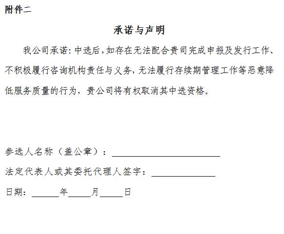 投標人應(yīng)在投標文件中承諾中選后,如存在無法配合我司完成申報及獲批工作、不積極履行責任與義務(wù),無法履行存續(xù)期管理工作等惡意降低服務(wù)質(zhì)量的行為,我公司將有權(quán)取消其中選資格。(見附件二)。