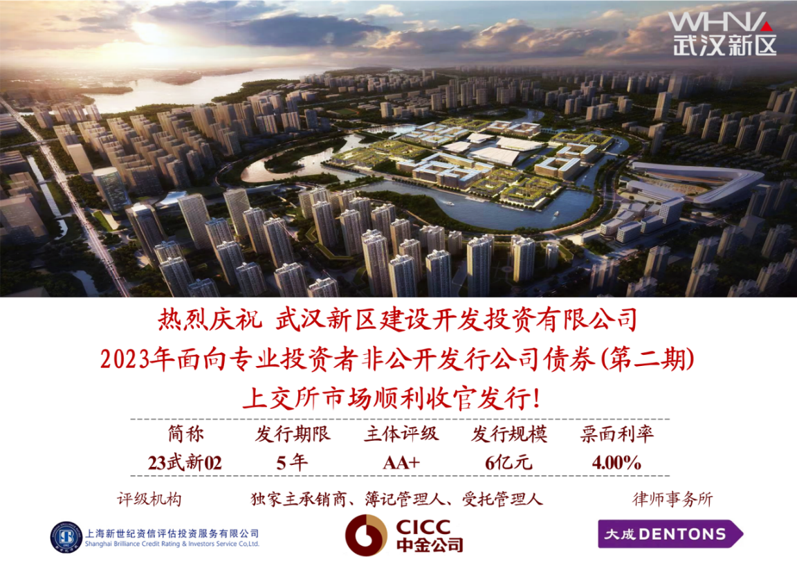 第二期公司債券(23武新02),期限5年,票面利率4.00%。兩期共發(fā)行公司債券15億元,發(fā)行價格低于市場估值50BP,不僅實現(xiàn)了優(yōu)化債務結構,降本增效的目的,而且為后續(xù)資金融通開辟更為寬闊的渠道,向金融創(chuàng)新賦能企業(yè)高質量發(fā)展又邁出堅實的一步!
