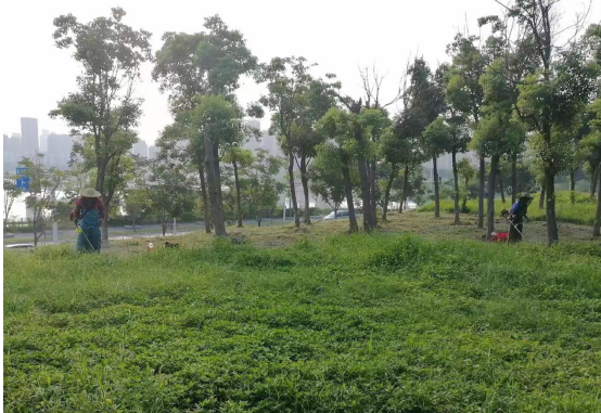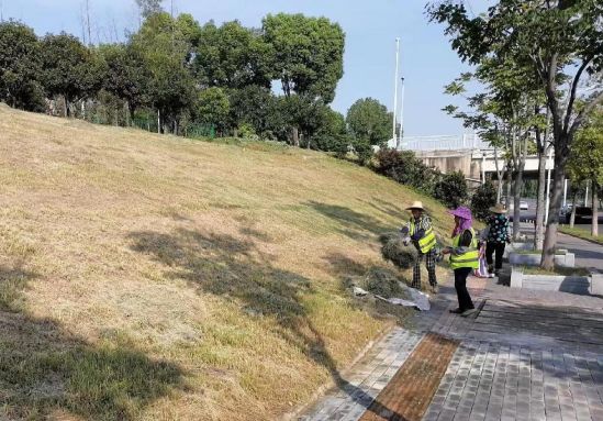 今年夏季,武漢雨量少,天氣悶熱,太陽火辣,七、八兩月給苗木生存帶來極大考驗,抗旱成為新雅景公司園林養(yǎng)護首要任務(wù)。從六月開始,新雅景公司的養(yǎng)護工作就進入了戰(zhàn)斗狀態(tài)。為減少植物死亡,對管轄區(qū)域內(nèi)所有綠地實行分類施策,為高大的喬木修剪枝葉;在綠植深處清理雜草;給新栽苗木掛營養(yǎng)液、搭設(shè)遮陽網(wǎng) ,草坪細澆慢灌。
